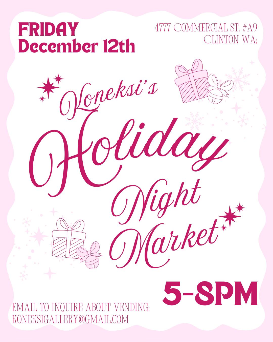 Join us for an evening of holiday shopping, sales, baked treats by @nisiwhidbey pop-up vendors and more at Koneksi’s Holiday Night Market! Wear your #holidayspirit Best outfit wins a prize Artist meet & greet at Koneksi includes @mama.ashlee @reyelton @res.plumata @ericlvargas7 @kilncandy C. Starkey, as well as artists making hand knit goods, custom fishing lures, and more.. on their merry way Our lovely Clinton neighbors will be open late especially for you at Madrona Supply Co. and Blackberry Moon Farm Soap We would love if you shopped locally for gifts this year! Friday, December 12th from 5-8pm