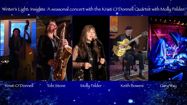 Winter’s Light: Insights Experience a wintery inspired evening with the Kristi O’Donnell Quartet, featuring special guest vocalist, Molly Felder, joined with musical colleagues: Tobi Stone/woodwinds, Keith Bowers/guitar, Gary Way/piano and Kristi with her upright bass, Emi.