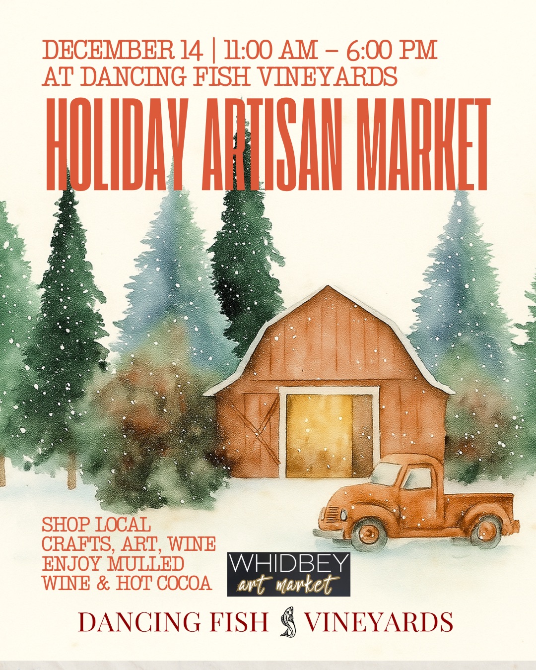 11:00 am - 6:00 pm No Reservations / Free AdmissionJoin us at the Dancing Fish Vineyards' Barn to shop gifts from Whidbey Art Market, some of your favorite Whidbey Island Artists and Craftspeople! Stroll through the cozy and festive Barn with a warm cup of mulled wine or hot cocoa and choose from a wide selection of beautiful items; jewelry, ceramics, wood, basketry, macrame, and so much more. Whidbey Art Market will have gifts to fit every budget and we look forward to sharing them with you!*Santa will be making an appearance from 2:00 - 4:00 pm, and the vineyards lights will magically twinkle on at 4:45 pm!*Celebrate the Holiday Season at Dancing Fish Vineyards!Hot Cocoa, mulled wine as well as Dancing Fish wine, beer and non-alcoholic beverages will be available for purchase.No Reservations, Free Admission.