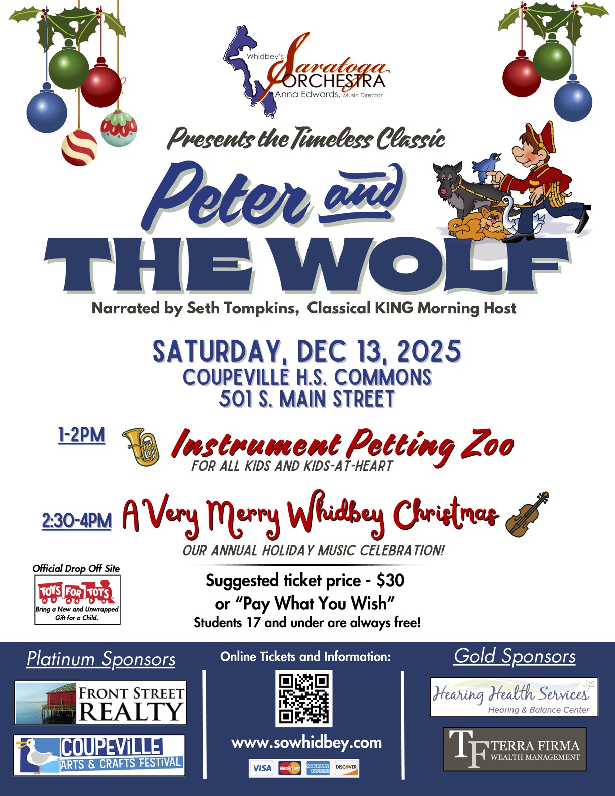 Whidbey’s Saratoga Orchestra invites families and music lovers of all ages to a delightful afternoon of music, learning, and holiday spirit at “A Very Merry Whidbey Concert” on Saturday, December 13 at Coupeville High School. Festivities begin at 1:00 p.m. with the orchestra’s popular and engaging Instrument Petting Zoo, where attendees can see, hear, and try out a variety of orchestral instruments. Musicians from the Saratoga Orchestra will be on hand to demonstrate instruments and offer a fun, hands-on experience for both the young and the young-at-heart. At 2:30 p.m., the orchestra will present a live performance of Sergei Prokofiev’s timeless classic, “Peter and the Wolf.” The concert will be conducted by Music Director Anna Edwards and will feature special guest narrator Seth Tompkins from Classical KING (98.1 FM). Seasonal holiday favorites and a few surprises round out the afternoon. The program is free to youth 17 and under. $30 suggested donation for adults and a “Pay What You Wish” option available. More information and online tickets at www.sowhidbey.com Founded in 2007, the Saratoga Orchestra of Whidbey Island is dedicated to enriching the cultural life of the Whidbey community through live orchestral performances, music education, and community engagement. Under the leadership of Music Director Anna Edwards, the orchestra brings together professional musicians and passionate community members to present innovative programs ranging from classical masterworks to contemporary collaborations. The organization also places a strong emphasis on youth education and outreach, inspiring future generations through music. Learn more at www.sowhidbey.com.