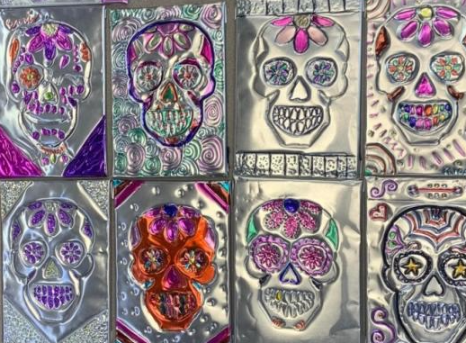 Participants will learn basic techniques of metal embossing using conventional kitchen items to create a unique piece of art. In this class, we will explore the different metal tools to add textures onto borders and corners. Once the design is embossed, we’ll proceed to add color using sharpies. As we work, we'll discuss the tradition of Dia de los Muertos, the significance of altars and objects to decorate such as sugar skulls, candles and flowers.