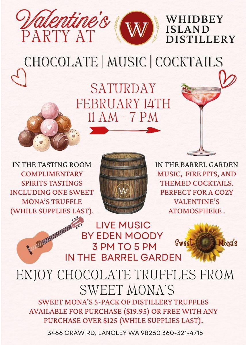 Celebrate Valentine’s Day in the sweetest way at the Valentine’s Party at Whidbey Island Distillery on Saturday, February 14, from 11 a.m. to 7 p.m.—a cozy, love-filled day of chocolate, music, and cocktails you won’t want to miss. No tickets required.